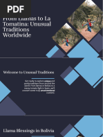 WEIRD TRADITIONS AND CELEBRATIONS If we look at traditions from the culture and history in the Western world or examine any other culture across the globe, we will notice that there are a number of weird traditions that seem extremely bizarre to us in the current century. And while they may seem weird to many of us (human sacrifice, dueling during the 15th - 20th centuries, foot binding in China during the 10 th-the early 20th century, neck rings worn by women in a few African and Asian cultures), they are perfectly acceptable in their cultures being a part of some kind of ritual. CHEESE ROLLING The Cooper's Hill Cheese-Rolling is an annual event held at Cooper's Hill near Gloucester, England. People from all over the world take part in this event though it is traditionally by and for the people who live in Brockworth, the local village. The event takes its name from the hill where everything happens. Once a year, young men and women hurl themselves down a hill so steep that it is impossible to remain standing, in pursuit of a seven or eight pound wheel of locally made Double Gloucester cheese. MONKEY BUFFET FESTIVAL The Monkey Buffet Festival is held annually in Thailand. Every year, about 2,000 monkeys are invited to eat fruits and vegetables during an annual feast held in honour of gods. The festival provides food and drinks to the local monkey population, thanking them for drawing tourists to the town. LA TOMATINA La Tomatina is a festival that is celebrated in the Valencian town of Bunol, in which participants throw tomatoes at each other making this chaotic event the world's biggest tomato fight and the brightest Spain's summer festival calendar with thousands of people coming to this little Valencian town. The origins of La Tomatina aren't clear. THE BURNING OF THE CLOCKS After the Winter Solstice the longest night of the year the days begin to get longer at last. Brighton celebrates the lengthening days with its own local Northern fire festival The Burning of the Clocks. The event includes a themed parade with as many as 1,000 participants, followed by the burning of paper and willow lanterns on the beach and a fireworks parade. WEARING POLKA DOTS Imagine streets full of people wearing polka dots and dining tables full of round shaped food and fruits on one single day of the year. This all actually happens in the Philippines on New Year's Eve every year. Filipinos believe that this will bring them prosperity by associating the round dots with coins and wealth.