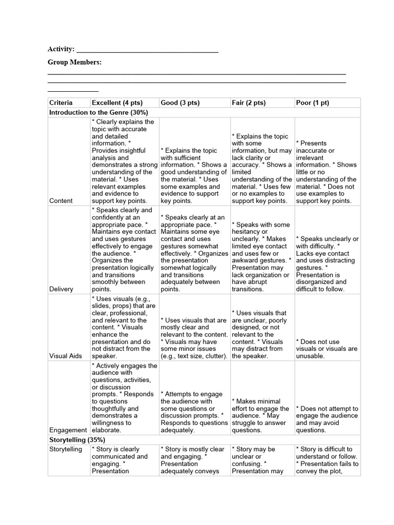 Criteria Excellent (4 pts) Good (3 pts) Fair (2 pts) Poor (1 pt)