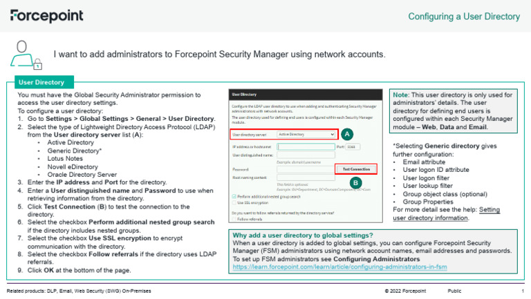 communication with the directory. When a user directory is added to global settings, you can configure Forcepoint Security
