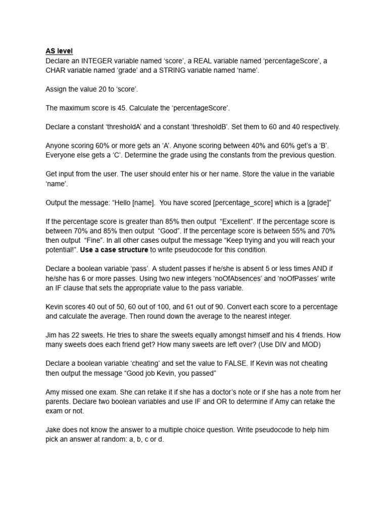 Declare an INTEGER variable named ‘score’, a REAL variable named ‘percentageScore’, a