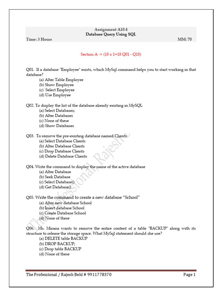 Section A -> (18 x 1=18 Q01 - Q18)