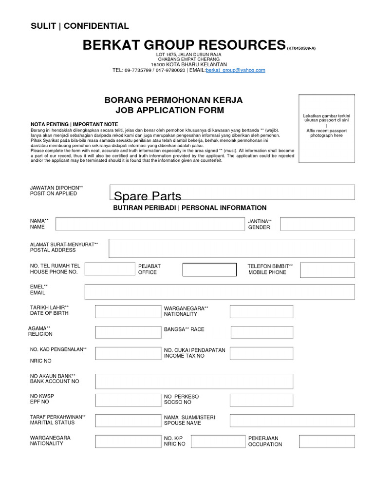 JOB APPLICATION FORM Lekatkan gambar terkini