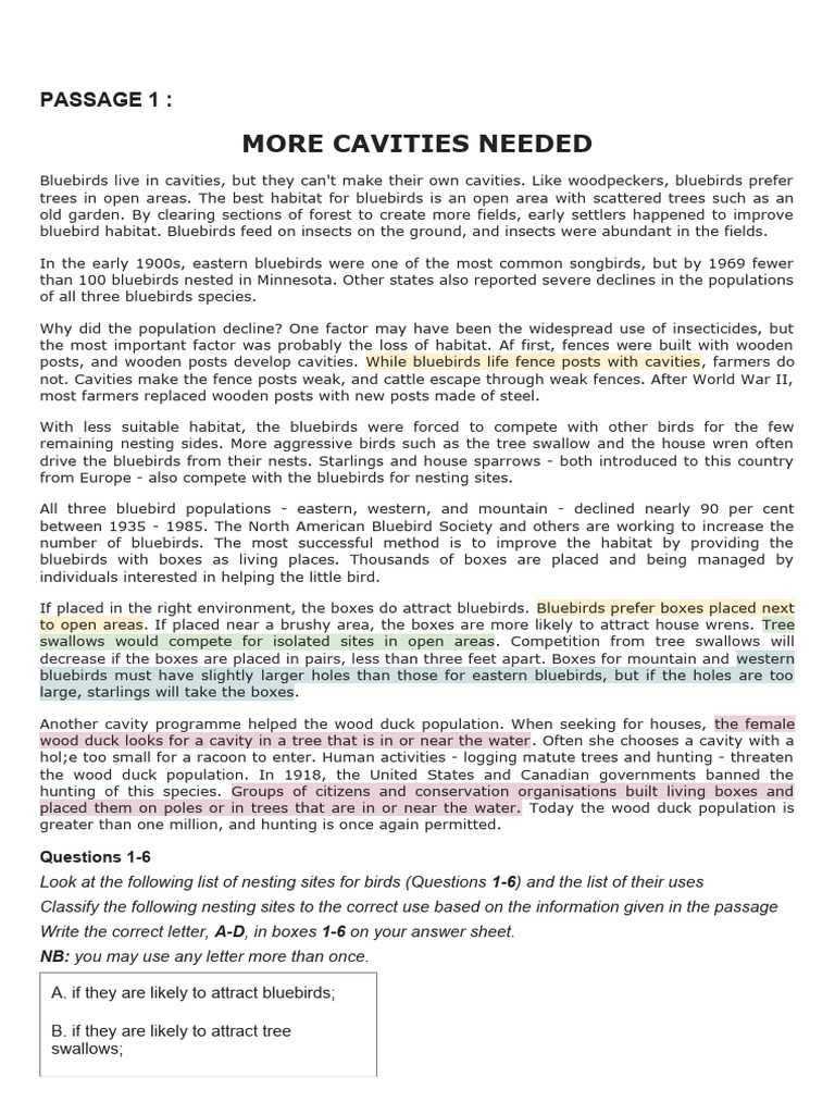Look at the following list of nesting sites for birds (Questions 1-6) and the list of their uses