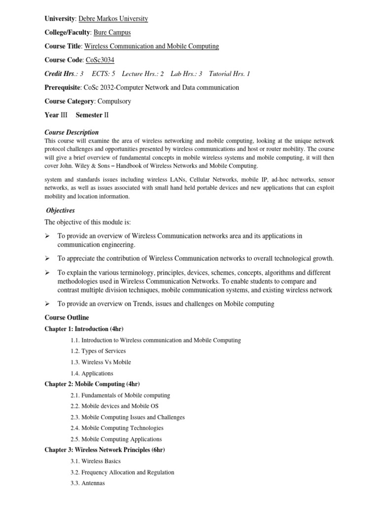 This course will examine the area of wireless networking and mobile computing, looking at the unique network