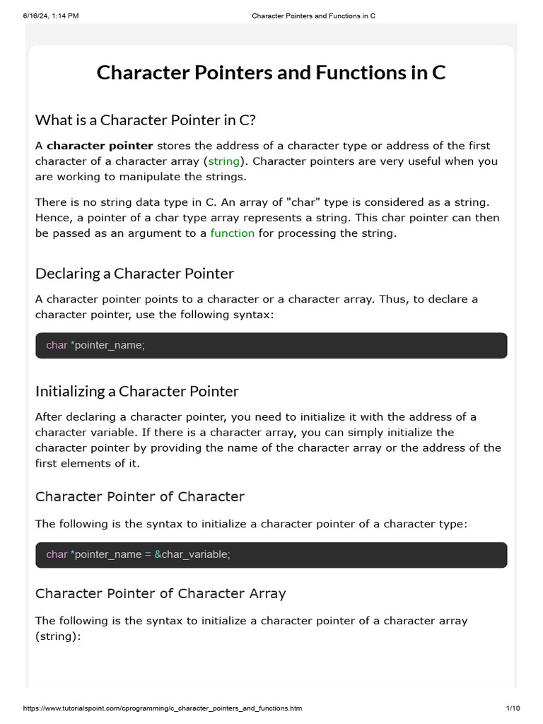 6/16/24, 1:14 PM Character Pointers and Functions in C