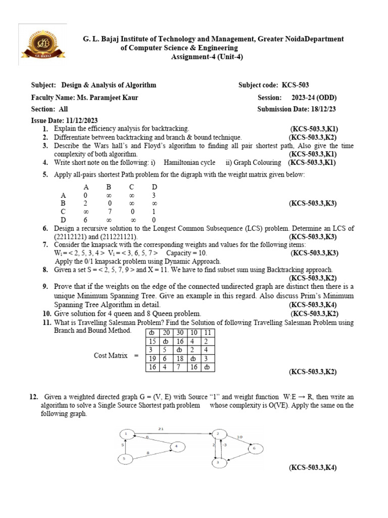 Subject: Design & Analysis of Algorithm Subject code: KCS-503