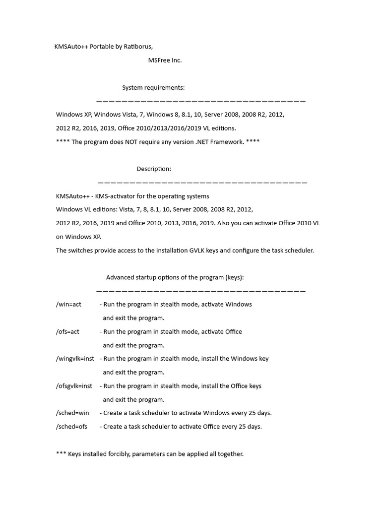The switches provide access to the installation GVLK keys and configure the task scheduler.