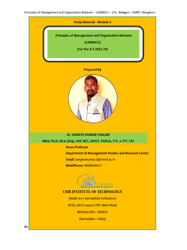 Principles of Management and Organization Behavior – 22MBA11 – VTU, Belagavi – CMRIT, Bengaluru