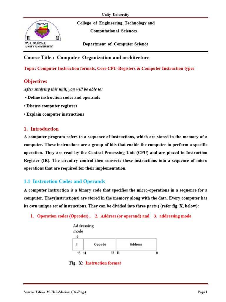 Topic: Computer Instruction formats, Core CPU-Registers & Computer Instruction types
