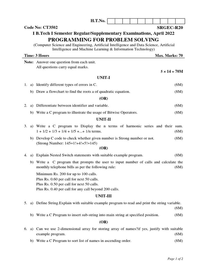 I B.Tech I Semester Regular/Supplementary Examinations, April 2022