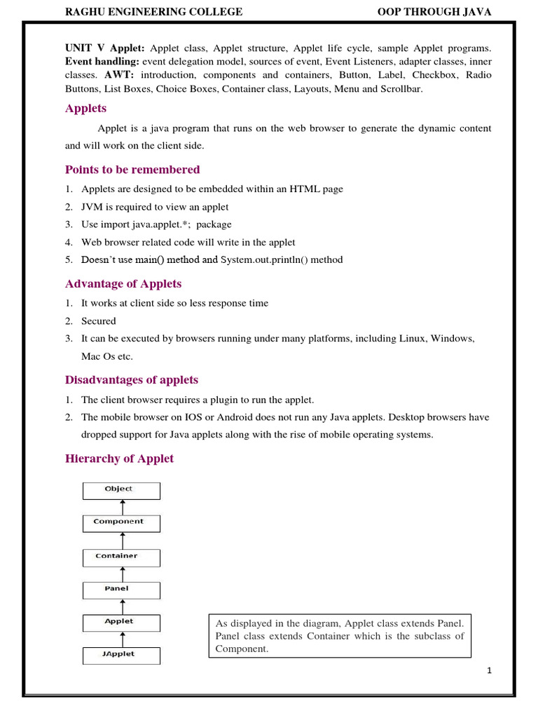 UNIT V Applet: Applet class, Applet structure, Applet life cycle, sample Applet programs.