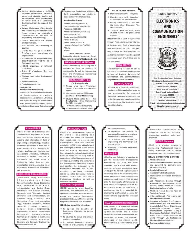 C/o. Engineering Today Building Membership Development Executive Plot No. 23-B, Meera Road, Devaraj Nagar, Selaiyur, Near Bharath University, Opp. Punjab National Bank, Chennai600073. Ph : 044-65372284 Mobile : 9790326929 E-Mail : iseceinfomembership@gmail.com Website : www.isece.org