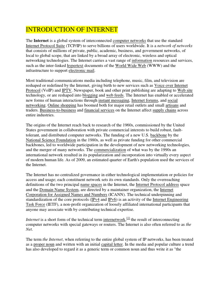 The Internet is a global system of interconnected computer networks that use the standard Internet Protocol Suite (TCP/IP) to serve billions of users worldwide. It is a network of networks that consists of millions of private, public, academic, business, and government networks, of local to global scope, that are linked by a broad array of electronic, wireless and optical networking technologies. The Internet carries a vast range of information resources and services, such as the inter-linked hypertext documents of the World Wide Web (WWW) and the infrastructure to support electronic mail. Most traditional communications media including telephone, music, film, and television are reshaped or redefined by the Internet, giving birth to new services such as Voice over Internet Protocol (VoIP) and IPTV. Newspaper, book and other print publishing are adapting to Web site technology, or are reshaped into blogging and web feeds. The Internet has enabled or accelerated new forms of human interactions through instant messaging, Internet forums, and social networking. Online shopping has boomed both for major retail outlets and small artisans and traders. Business-to-business and financial services on the Internet affect supply chains across entire industries. The origins of the Internet reach back to research of the 1960s, commissioned by the United States government in collaboration with private commercial interests to build robust, faulttolerant, and distributed computer networks. The funding of a new U.S. backbone by the National Science Foundation in the 1980s, as well as private funding for other commercial backbones, led to worldwide participation in the development of new networking technologies, and the merger of many networks. The commercialization of what was by the 1990s an international network resulted in its popularization and incorporation into virtually every aspect of modern human life. As of 2009, an estimated quarter of Earth's population used the services of the Internet. The Internet has no centralized governance in either technological implementation or policies for access and usage; each constituent network sets its own standards. Only the overreaching definitions of the two principal name spaces in the Internet, the Internet Protocol address space and the Domain Name System, are directed by a maintainer organization, the Internet Corporation for Assigned Names and Numbers (ICANN). The technical underpinning and standardization of the core protocols (IPv4 and IPv6) is an activity of the Internet Engineering Task Force (IETF), a non-profit organization of loosely affiliated international participants that anyone may associate with by contributing technical expertise. Internet is a short form of the technical term internetwork,[1] the result of interconnecting computer networks with special gateways or routers. The Internet is also often referred to as the Net. The term the Internet, when referring to the entire global system of IP networks, has been treated as a proper noun and written with an initial capital letter. In the media and popular culture a trend has also developed to regard it as a generic term or common noun and thus write it as "the