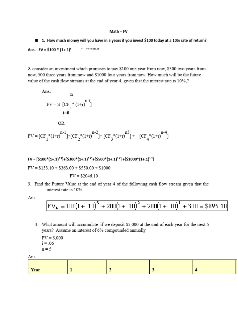 Ans. FV = $100 * (1+.1)5 = FV = $161.05