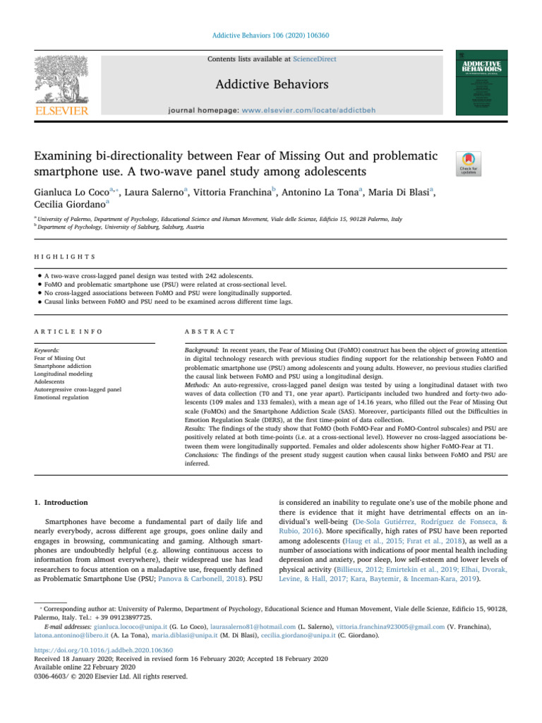 Keywords: Background: In recent years, the Fear of Missing Out (FoMO) construct has been the object of growing attention