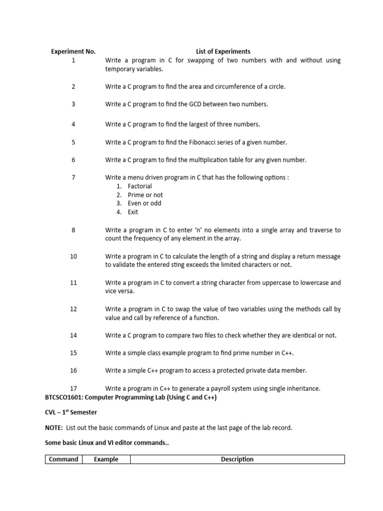 BTCSCO1601: Computer Programming Lab (Using C and C++)