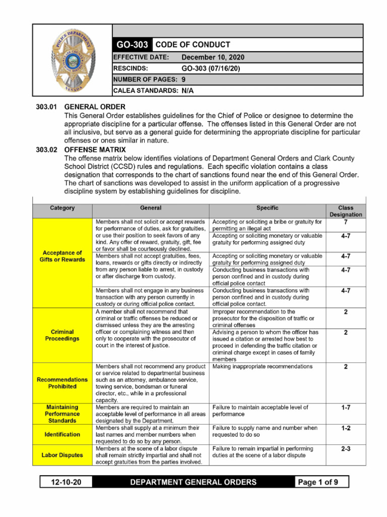 The offense matrix below identifies violations of Department General Orders and Clark County