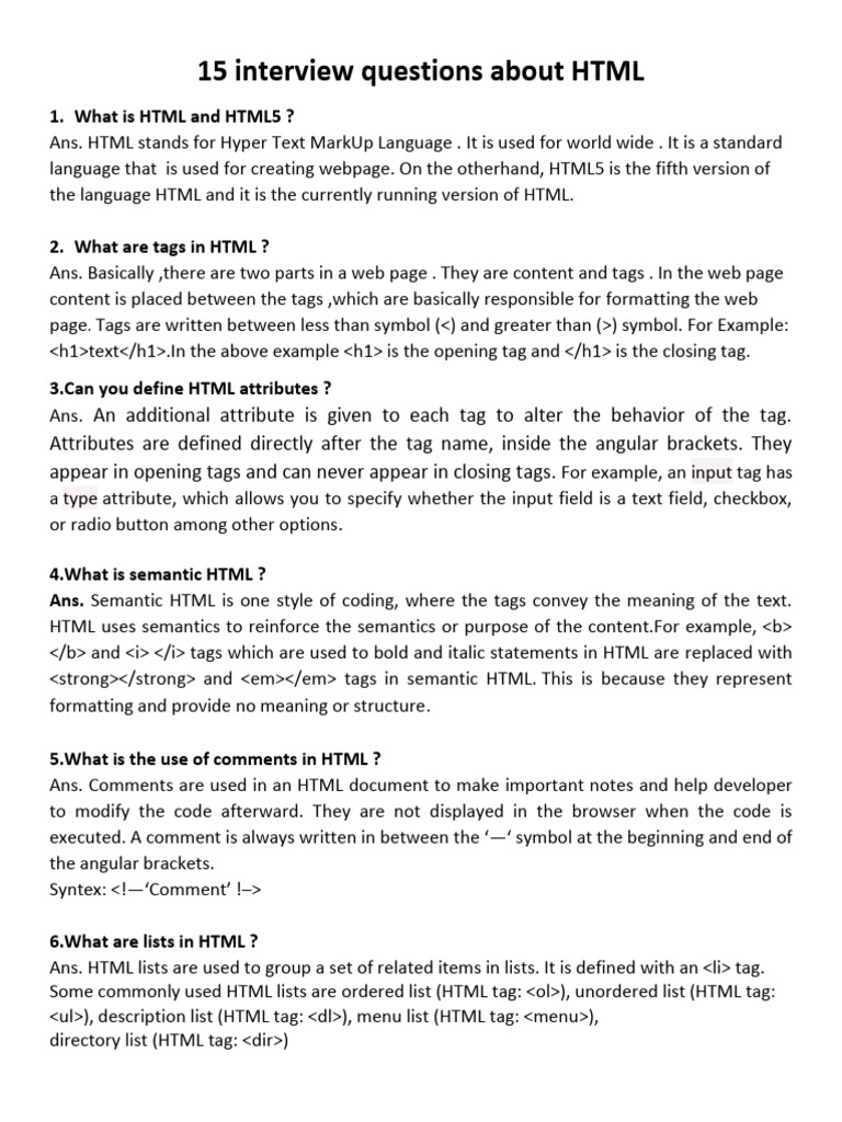 Ans. HTML stands for Hyper Text MarkUp Language . It is used for world wide . It is a standard