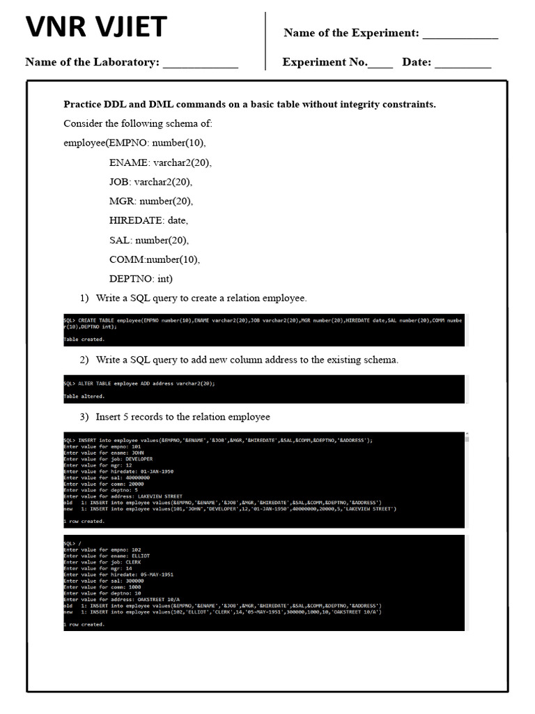 Practice DDL and DML commands on a basic table without integrity constraints.