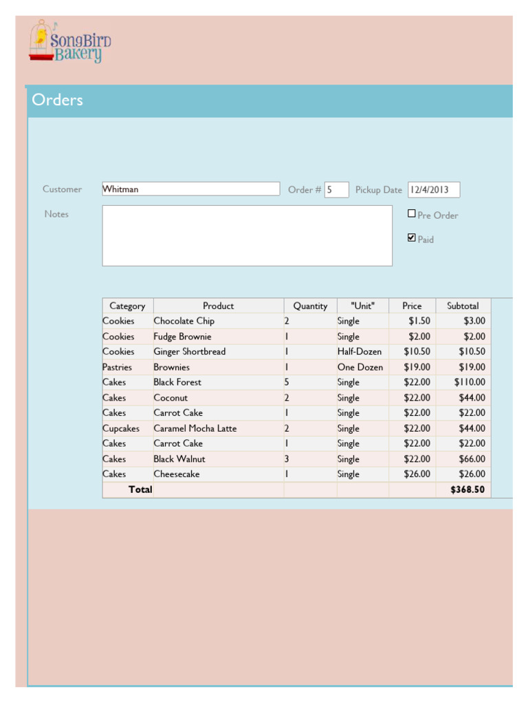 Customer Whitman Order # 5 Pickup Date 12/4/2013