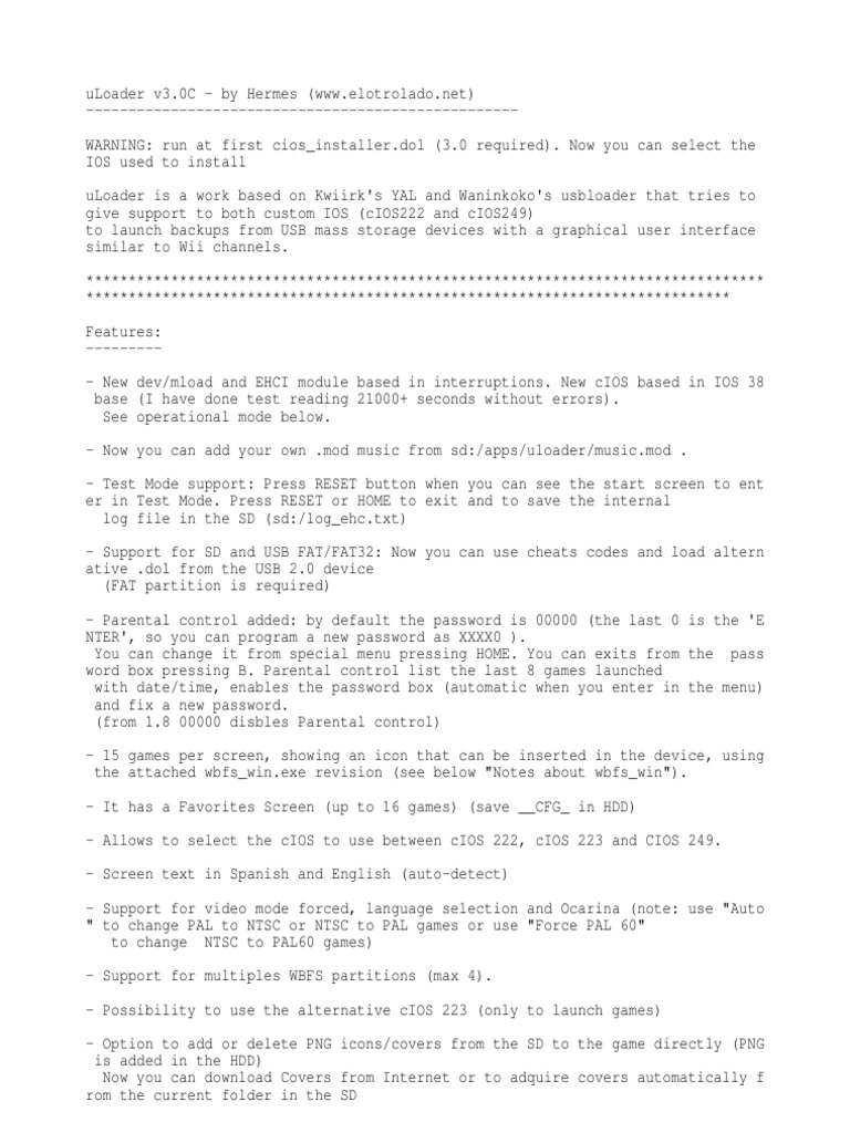 Now you can select the IOS used to install uLoader is a work based on Kwiirk's YAL and Waninkoko's usbloader that tries to give support to both custom IOS (cIOS222 and cIOS249) to launch backups from USB mass storage devices with a graphical user interface similar to Wii channels. ******************************************************************************** **************************************************************************** Features: --------- New dev/mload and EHCI module based in interruptions. New cIOS based in IOS 38 base (I have done test reading 21000+ seconds without errors). See operational mode below. - Now you can add your own .mod music from sd:/apps/uloader/music.mod . - Test Mode support: Press RESET button when you can see the start screen to ent er in Test Mode. Press RESET or HOME to exit and to save the internal log file in the SD (sd:/log_ehc.txt) - Support for SD and USB FAT/FAT32: Now you can use cheats codes and load altern ative .dol from the USB 2.0 device (FAT partition is required) - Parental control added: by default the password is 00000 (the last 0 is the 'E NTER', so you can program a new password as XXXX0 ). You can change it from special menu pressing HOME. You can exits from the pass word box pressing B. Parental control list the last 8 games launched with date/time, enables the password box (automatic when you enter in the menu) and fix a new password. (from 1.8 00000 disbles Parental control) - 15 games per screen, showing an icon that can be inserted in the device, using the attached wbfs_win.exe revision (see below "Notes about wbfs_win"). - It has a Favorites Screen (up to 16 games) (save __CFG_ in HDD) - Allows to select the cIOS to use between cIOS 222, cIOS 223 and CIOS 249. - Screen text in Spanish and English (auto-detect) - Support for video mode forced, language selection and Ocarina (note: use "Auto " to change PAL to NTSC or NTSC to PAL games or use "Force PAL 60" to change NTSC to PAL60 games) - Support for multiples WBFS partitions (max 4). - Possibility to use the alternative cIOS 223 (only to launch games) - Option to add or delete PNG icons/covers from the SD to the game directly (PNG is added in the HDD) Now you can download Covers from Internet or to adquire covers automatically f rom the current folder in the SD