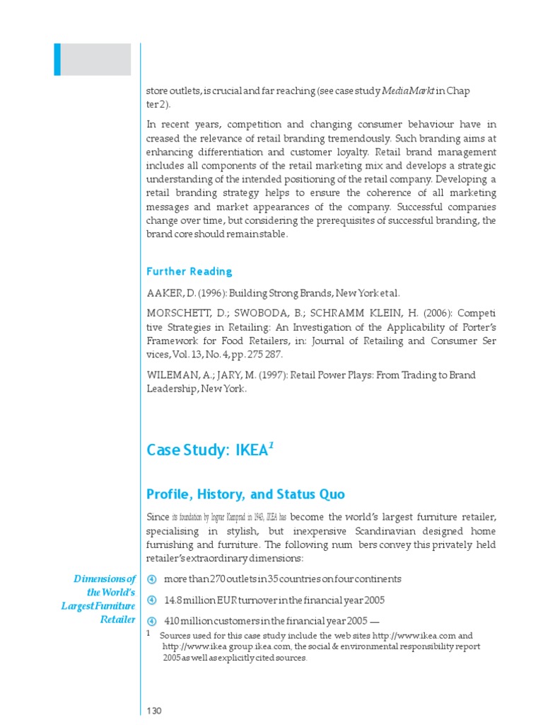but IKEA introduced its trademark light Scandinavian style, character ised by blonde wood, natural material and modern design (cf. Kling/Goteman 2003, pp. 31 32). Hence, the main dimensions of retailing which establish IKEAs positioning (see section Retail Brand Positioning) are clearly price, variety of mer chandise, and store atmosphere. IKEA offers the same product range on an international scale, and adapts the store layouts, presentation of the prod ucts, home services offered, and prices only where necessary in accordance with national economic and cultural conditions and circumstances. This enables IKEA to transfer its profile appropriately worldwide (Miller 2004, p. 37). The retailer standardises as much as possible and adapts only what is necessary. There is, for example, only one set of instructions for the assembly of a piece of furniture, regardless of country, because it contains no written language, but only visual instructions (Levy/Weitz 2007, p. 141). Positioning Dimensions