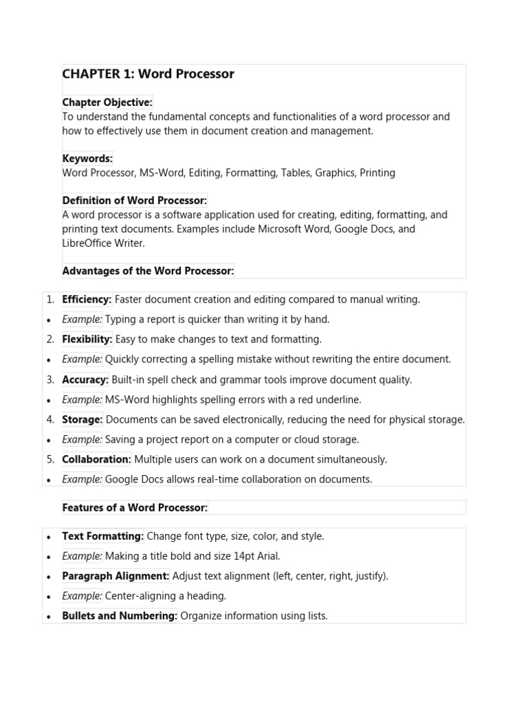 Word Processor, MS-Word, Editing, Formatting, Tables, Graphics, Printing