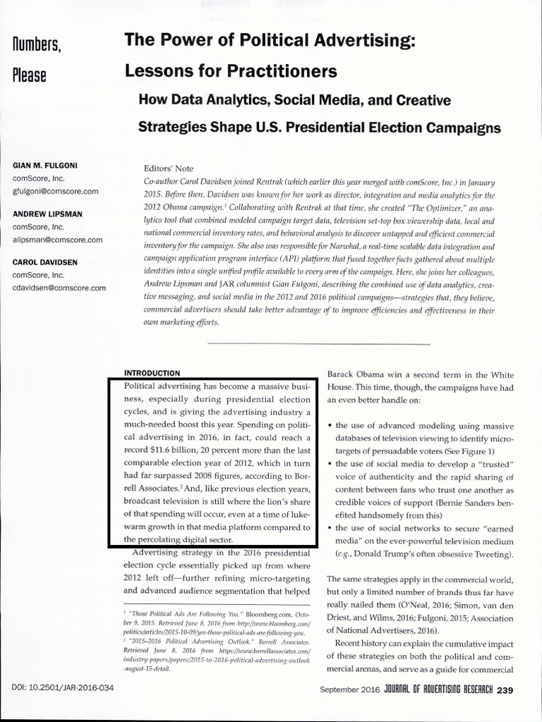 cdavidsen@comscore.com Andrew Lipsman and JAR columnist Gian Fulgoni, describing the combined use of data analytics, crea