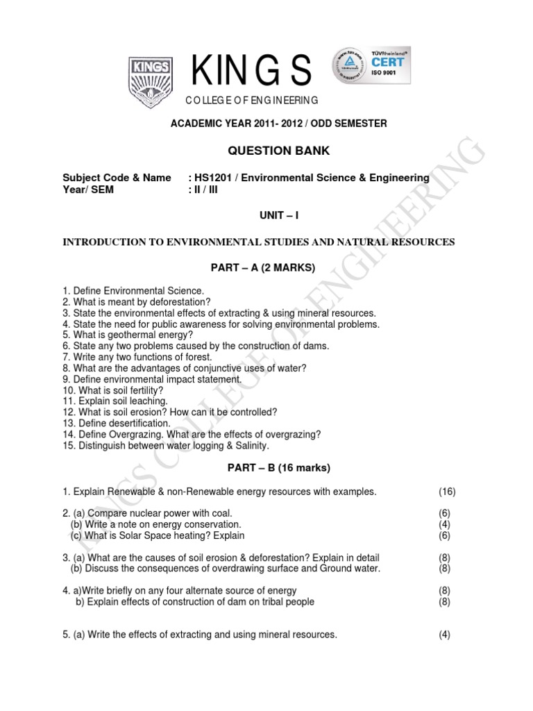 1. Define Environmental Science. 2. What is meant by deforestation? 3. State the environmental effects of extracting & using mineral resources. 4. State the need for public awareness for solving environmental problems. 5. What is geothermal energy? 6. State any two problems caused by the construction of dams. 7. Write any two functions of forest. 8. What are the advantages of conjunctive uses of water? 9. Define environmental impact statement. 10. What is soil fertility? 11. Explain soil leaching. 12. What is soil erosion? How can it be controlled? 13. Define desertification. 14. Define Overgrazing. What are the effects of overgrazing? 15. Distinguish between water logging & Salinity.