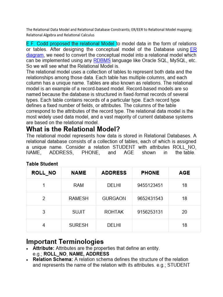 a unique name. Consider a relation STUDENT with attributes ROLL_NO,