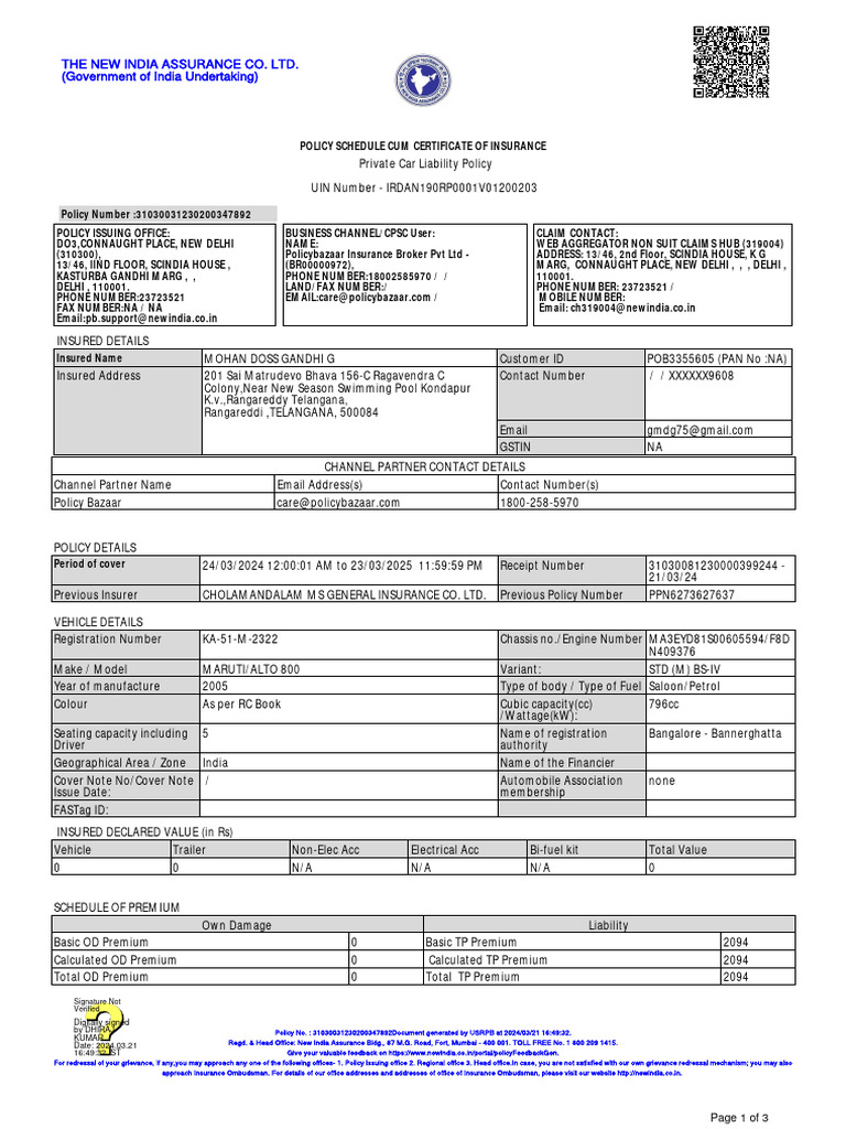 by DHIRAJ Policy No. : 31030031230200347892Document generated by USRPB at 2024/03/21 16:49:32.