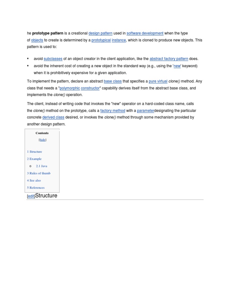 [edit]Example The Prototype pattern specifies the kind of objects to create using a prototypical instance. Prototypes of new products are often built prior to full production, but in this example, the prototype is passive and does not participate in copying itself. The mitotic division of a cell - resulting in two identical cells - is an example of a prototype that plays an active role in copying itself and thus, demonstrates the Prototype pattern. When a cell splits, two cells of identical genotype result. In other words, the cell clones itself. [edit]Java /** * Prototype class */ abstract class Prototype implements Cloneable { @Override public Object clone() throws CloneNotSupportedException { return super.clone(); } public abstract void setX(int x); public abstract void printX(); public abstract int getX(); } /** * Implementation of prototype class */