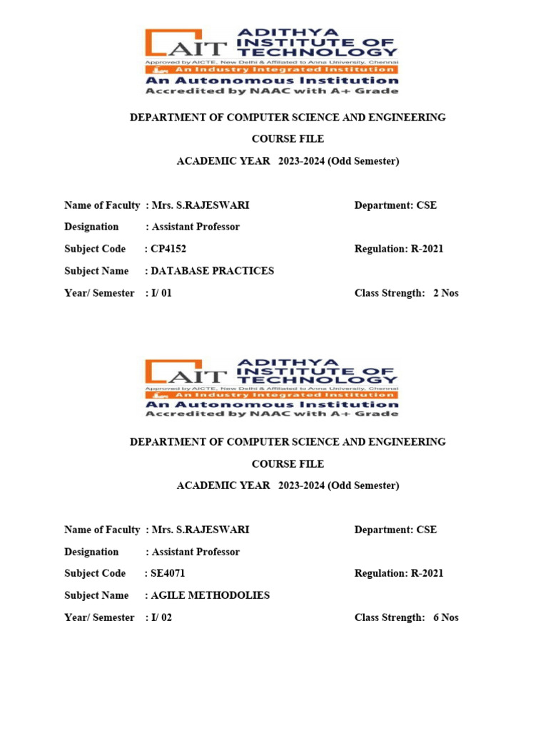 Name of Faculty : Mrs.S.Rajeswari Department: M.E.CSE