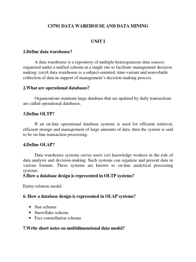 UNIT I 1.Define data warehouse? A data warehouse is a repository of multiple heterogeneous data sources organized under a unified schema at a single site to facilitate management decision making .(or)A data warehouse is a subject-oriented, time-variant and nonvolatile collection of data in support of managements decision-making process. 2.What are operational databases? Organizations maintain large database that are updated by daily transactions are called operational databases. 3.Define OLTP? If an on-line operational database systems is used for efficient retrieval, efficient storage and management of large amounts of data, then the system is said to be on-line transaction processing. 4.Define OLAP? Data warehouse systems serves users (or) knowledge workers in the role of data analysis and decision-making. Such systems can organize and present data in various formats. These systems are known as on-line analytical processing systems. 5.How a database design is represented in OLTP systems? Entity-relation model 6. How a database design is represented in OLAP systems? Star schema Snowflake schema Fact constellation schema 7.Write short notes on multidimensional data model?