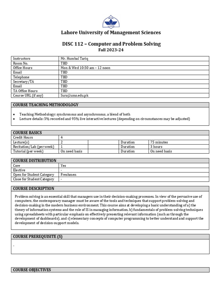 theory of information systems and the role of IS in managing information, b) fundamentals of problem-solving techniques