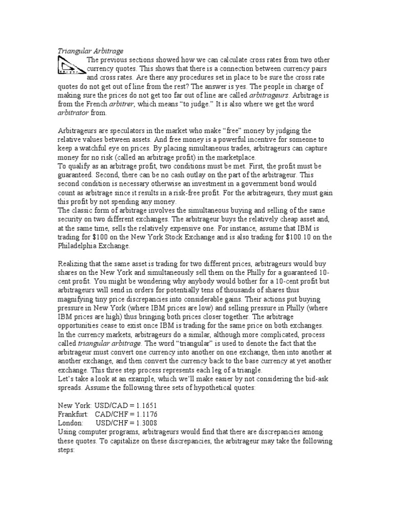 quotes. This shows that there is a connection between currency pairs and cross rates. Are there any procedures set in place to be sure the cross rate quotes do not get out of line from the rest? The answer is yes. The people in charge of making sure the prices do not get too far out of line are called arbitrageurs. Arbitrage is from the French arbitrer, which means to judge. It is also where we get the word arbitrator from. Arbitrageurs are speculators in the market who make free money by judging the relative values between assets. And free money is a powerful incentive for someone to keep a watchful eye on prices. By placing simultaneous trades, arbitrageurs can capture money for no risk (called an arbitrage profit) in the marketplace. To qualify as an arbitrage profit, two conditions must be met. First, the profit must be guaranteed. Second, there can be no cash outlay on the part of the arbitrageur. This second condition is necessary otherwise an investment in a government bond would count as arbitrage since it results in a risk-free profit. For the arbitrageurs, they must gain this profit by not spending any money. The classic form of arbitrage involves the simultaneous buying and selling of the same security on two different exchanges. The arbitrageur buys the relatively cheap asset and, at the same time, sells the relatively expensive one. For instance, assume that IBM is trading for $100 on the New York Stock Exchange and is also trading for $100.10 on the Philadelphia Exchange. Realizing that the same asset is trading for two different prices, arbitrageurs would buy shares on the New York and simultaneously sell them on the Philly for a guaranteed 10cent profit. You might be wondering why anybody would bother for a 10-cent profit but arbitrageurs will send in orders for potentially tens of thousands of shares thus magnifying tiny price discrepancies into considerable gains. Their actions put buying pressure in New York (where IBM prices are low) and selling pressure in Philly (where IBM prices are high) thus bringing both prices closer together. The arbitrage opportunities cease to exist once IBM is trading for the same price on both exchanges. In the currency markets, arbitrageurs do a similar, although more complicated, process called triangular arbitrage. The word triangular is used to denote the fact that the arbitrageur must convert one currency into another on one exchange, then into another at another exchange, and then convert the currency back to the base currency at yet another exchange. This three step process represents each leg of a triangle. Lets take a look at an example, which well make easier by not considering the bid-ask spreads. Assume the following three sets of hypothetical quotes: New York: USD/CAD = 1.1651 Frankfurt: CAD/CHF = 1.1176 London: USD/CHF = 1.3008 Using computer programs, arbitrageurs would find that there are discrepancies among these quotes. To capitalize on these discrepancies, the arbitrageur may take the following steps: