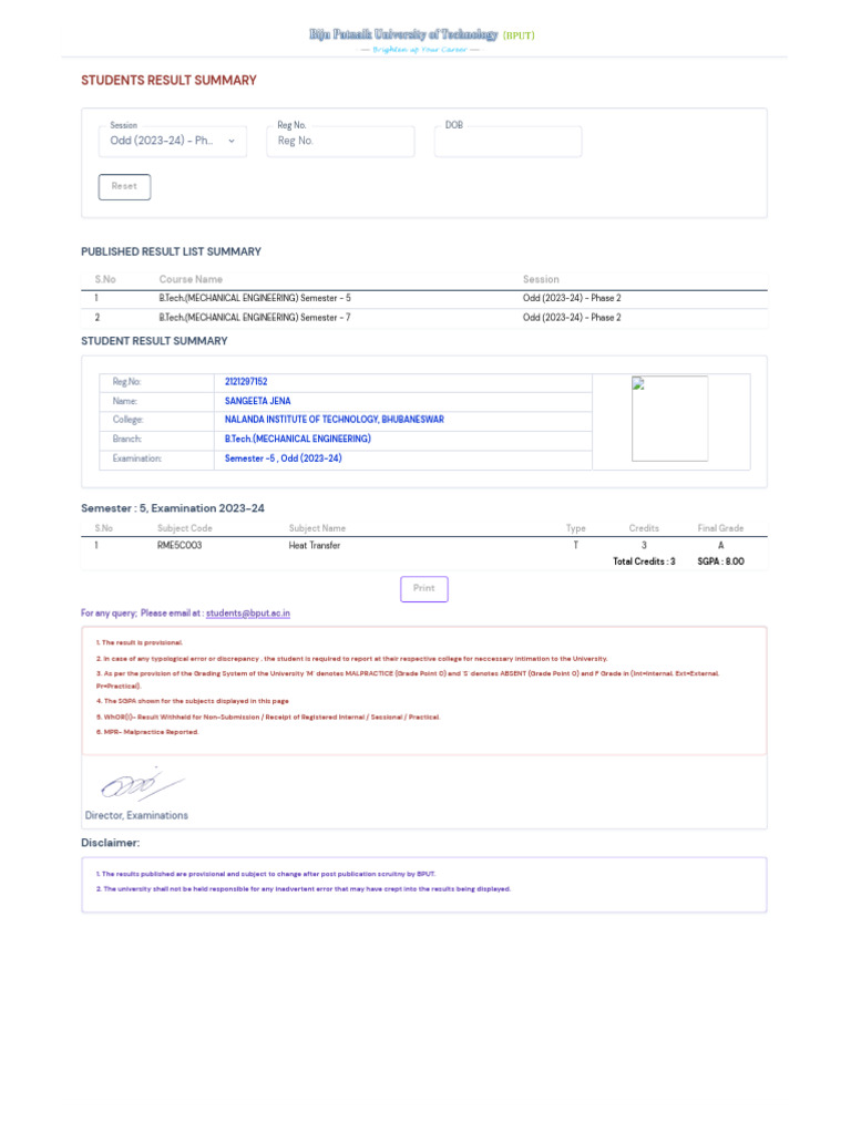 1. The results published are provisional and subject to change after post publication scruitny by BPUT.