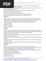 Answer: A (167) Your project is running out of cash and significant work remains. You are directed by senior management to instruct your people to use another project's c harge numbers while working on your project. You should: 1. Follow instructions 2. Inform the corporate auditors 3. Understand the background of management's instructions before taking any action 4. Try to close down the project Answer: C (168) Project Managers can contribute to their organization's knowledge base and to the profession of project management most effectively by: 1. Developing and implementing a project review and lessons learned process 2. Establishing strict guidelines for protecting intellectual property 3. Promote the use of ad hoc project management 4. Ensuring that all project plans are developed before the project team is formed Answer: A (169) For a festival, you give your government client a leather brief case. You are in violation of the responsibility to: 1. Comply with the law. 2. Comply with regulations. 3. Provide accurate information. 4. Protect conflict of interest. Answer: B (170) You have just changed jobs and discovered that your new employer routinely violates OSHA/EPA and affirmative action requirements on projects. You should: 1. Do nothing; it's not your problem 2. Start by asking management if they are aware that regulations are being violated 3. Talk to the corporate legal department 4. Inform the appropriate government agencies about the violations Answer: B (171) During your assignment as project manager you add a new member to your pro ject team. This new team member was recently hired from a competitor and offers to share a substantial amount of proprietary information from his previous compa ny. This information could put you and your team in a very strong position for f uture business. You are aware of a non-compete clause in the new hire's conditio n of employment. You should: 1. Accept the information and agree to keep it confidential between you and the new hire. 2. Review the condition of employment with the new hire and advise her to r econsider the offer. 3. Review the information and only accept only what may have a direct impac t on the project's financial status. 4. Ignore the offer to share and move forward with the project Answer: B (172) Before reporting a perceived violation of an established rule or policy th e project manager should: 1. Determine the risks associated with the violation 2. Ensure there is a reasonably clear and factual basis for reporting the v iolation 3. Ignore the violation until it actually affects the project results 4. Convene a committee to review the violation and determine the appropriat e response Answer: B (173) A response to a negative risk event is known as a: 1. Work Item 2. Work Package