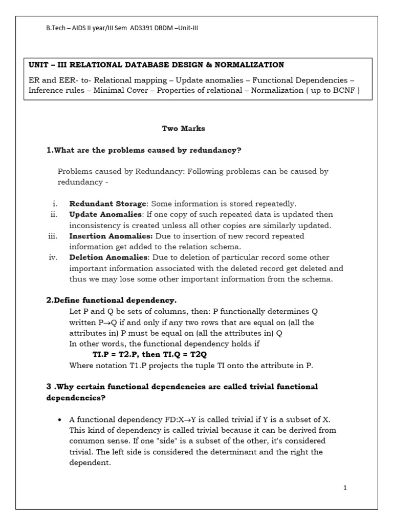 UNIT – III RELATIONAL DATABASE DESIGN & NORMALIZATION