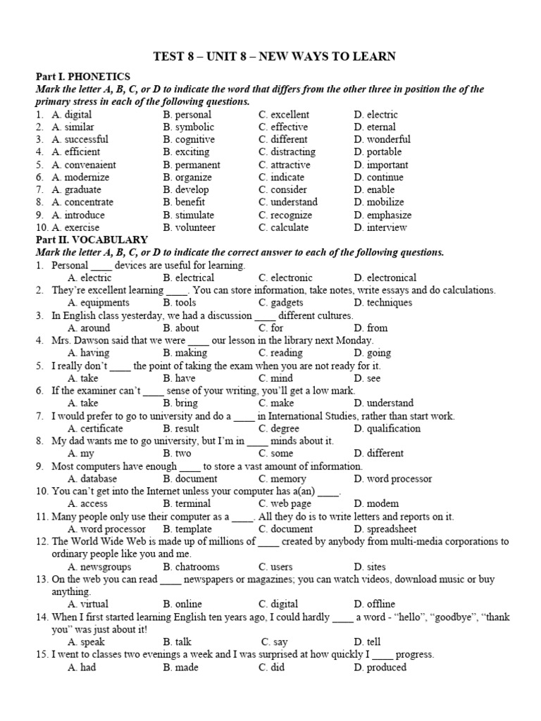 TEST 8 – UNIT 8 – NEW WAYS TO LEARN