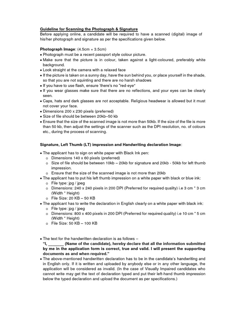 for uploading Photograph, signature, left thumb impression and handwritten declaration