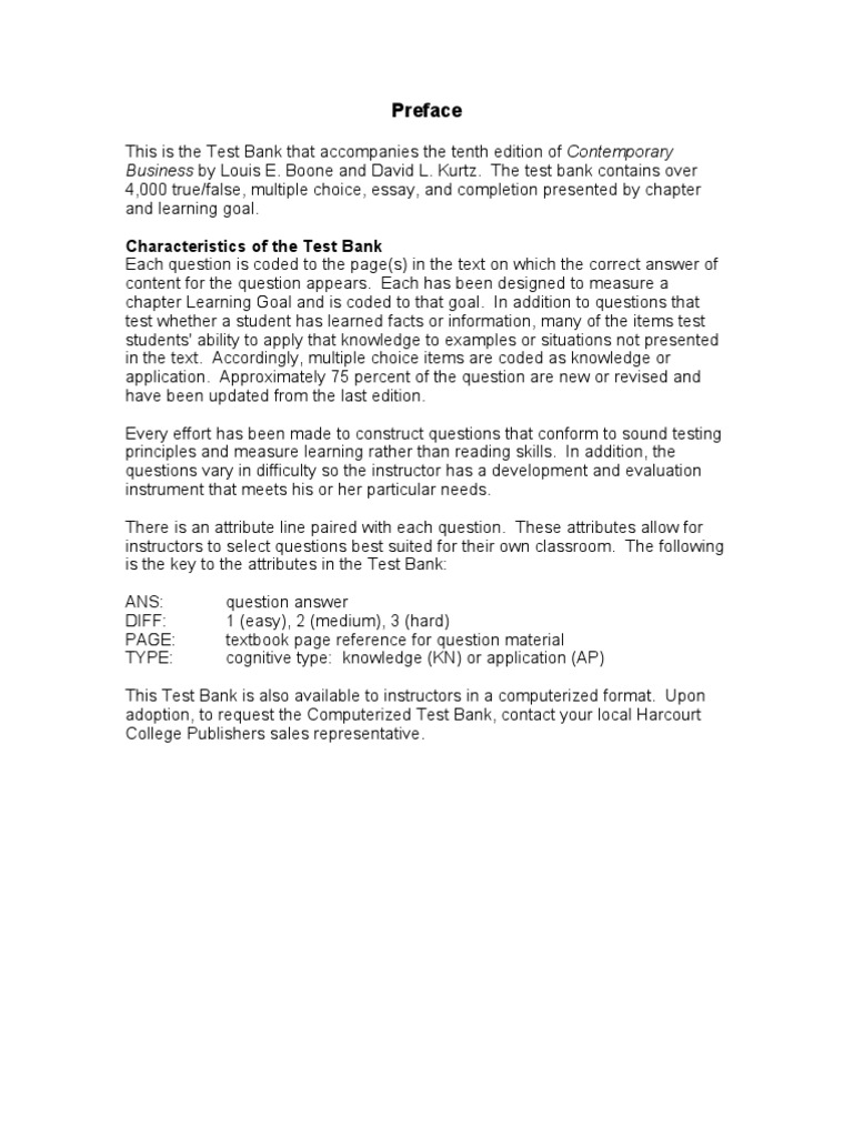 This is the Test Bank that accompanies the tenth edition of Contemporary Business by Louis E. Boone and David L. Kurtz. The test bank contains over 4,000 true/false, multiple choice, essay, and completion presented by chapter and learning goal. Characteristics of the Test Bank Each question is coded to the page(s) in the text on which the correct answer of content for the question appears. Each has been designed to measure a chapter Learning Goal and is coded to that goal. In addition to questions that test whether a student has learned facts or information, many of the items test students' ability to apply that knowledge to examples or situations not presented in the text. Accordingly, multiple choice items are coded as knowledge or application. Approximately 75 percent of the question are new or revised and have been updated from the last edition. Every effort has been made to construct questions that conform to sound testing principles and measure learning rather than reading skills. In addition, the questions vary in difficulty so the instructor has a development and evaluation instrument that meets his or her particular needs. There is an attribute line paired with each question. These attributes allow for instructors to select questions best suited for their own classroom. The following is the key to the attributes in the Test Bank: ANS: DIFF: PAGE: TYPE: question answer 1 (easy), 2 (medium), 3 (hard) textbook page reference for question material cognitive type: knowledge (KN) or application (AP)