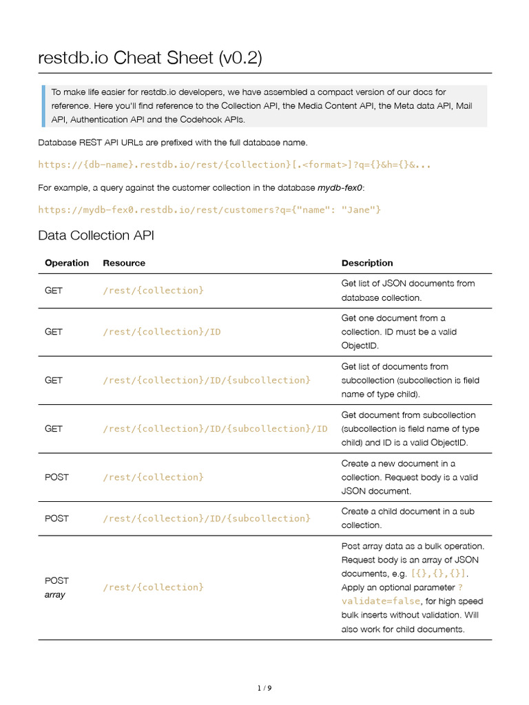 To make life easier for restdb.io developers, we have assembled a compact version of our docs for