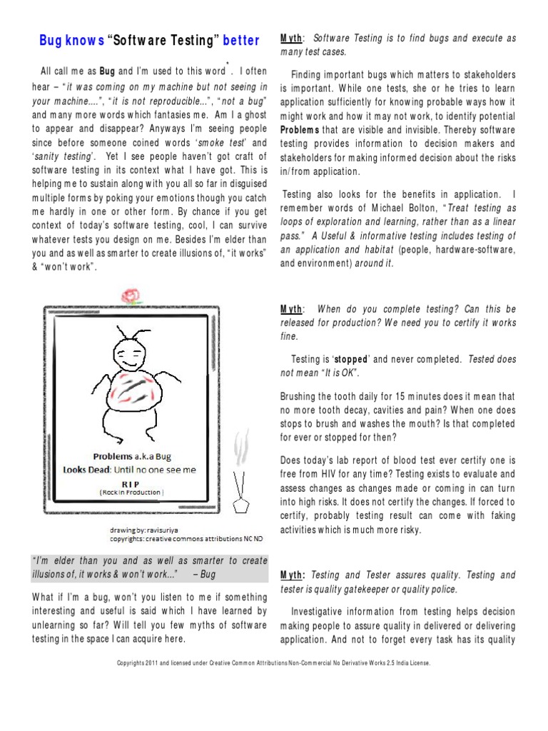 Myth: When do you complete testing? Can this be released for production? We need you to certify it works fine. Testing is stopped and never completed. Tested does not mean It is OK. Brushing the tooth daily for 15 minutes does it mean that no more tooth decay, cavities and pain? When one does stops to brush and washes the mouth? Is that completed for ever or stopped for then? Does todays lab report of blood test ever certify one is free from HIV for any time? Testing exists to evaluate and assess changes as changes made or coming in can turn into high risks. It does not certify the changes. If forced to certify, probably testing result can come with faking activities which is much more risky. Im elder than you and as well as smarter to create illusions of, it works & wont work Bug What if Im a bug, wont you listen to me if something interesting and useful is said which I have learned by unlearning so far? Will tell you few myths of software testing in the space I can acquire here.