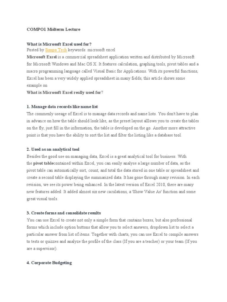 COMPO1 Midterm Lecture What is Microsoft Excel used for?