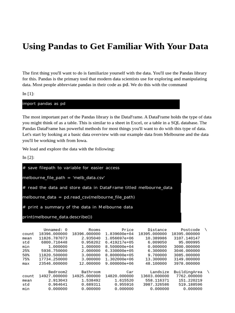 The first thing you'll want to do is familiarize yourself with the data. You'll use the Pandas library