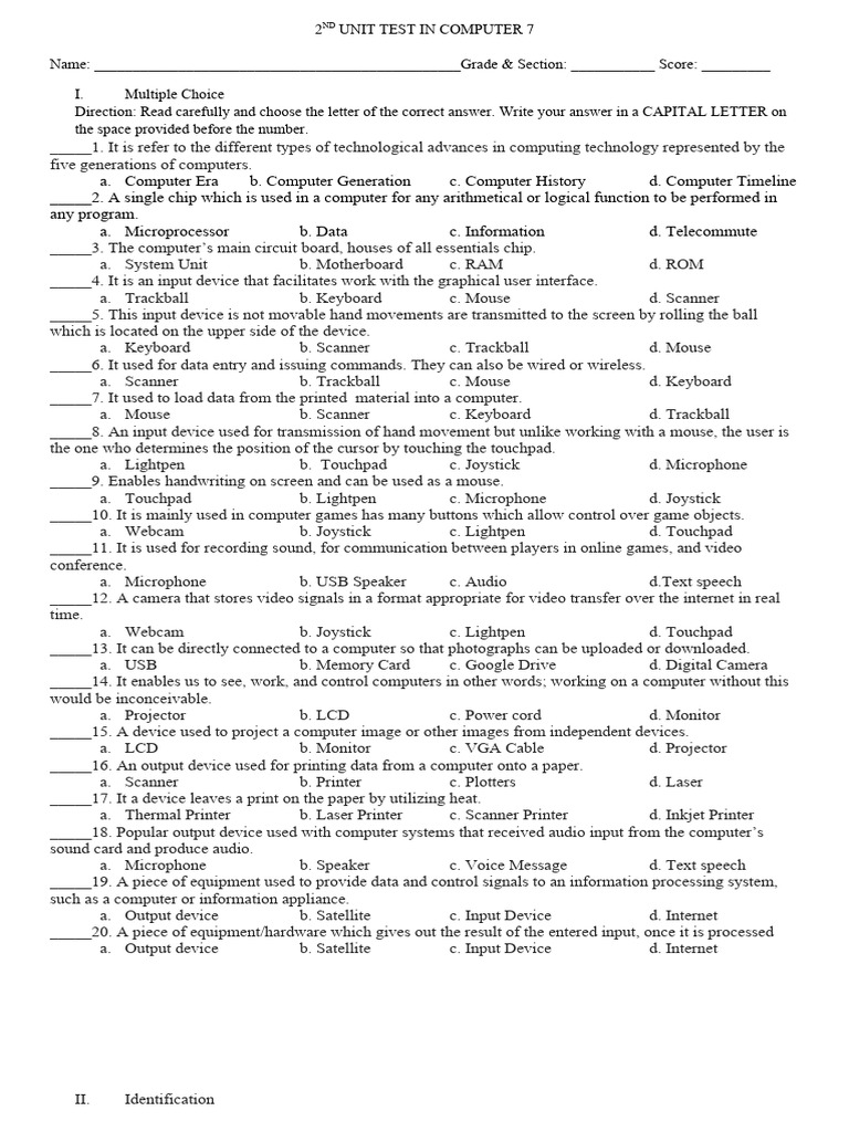 _____20. A piece of equipment/hardware which gives out the result of the entered input, once it is processed