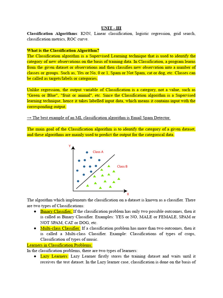 The Classification algorithm is a Supervised Learning technique that is used to identify the