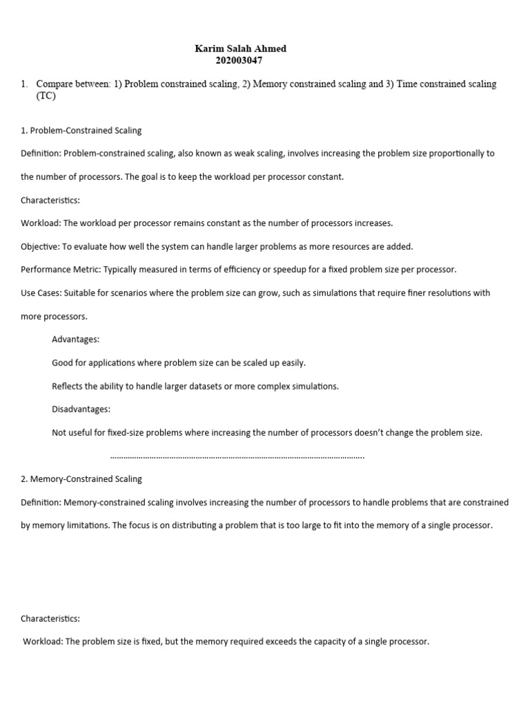 1. Compare between: 1) Problem constrained scaling, 2) Memory constrained scaling and 3) Time constrained scaling