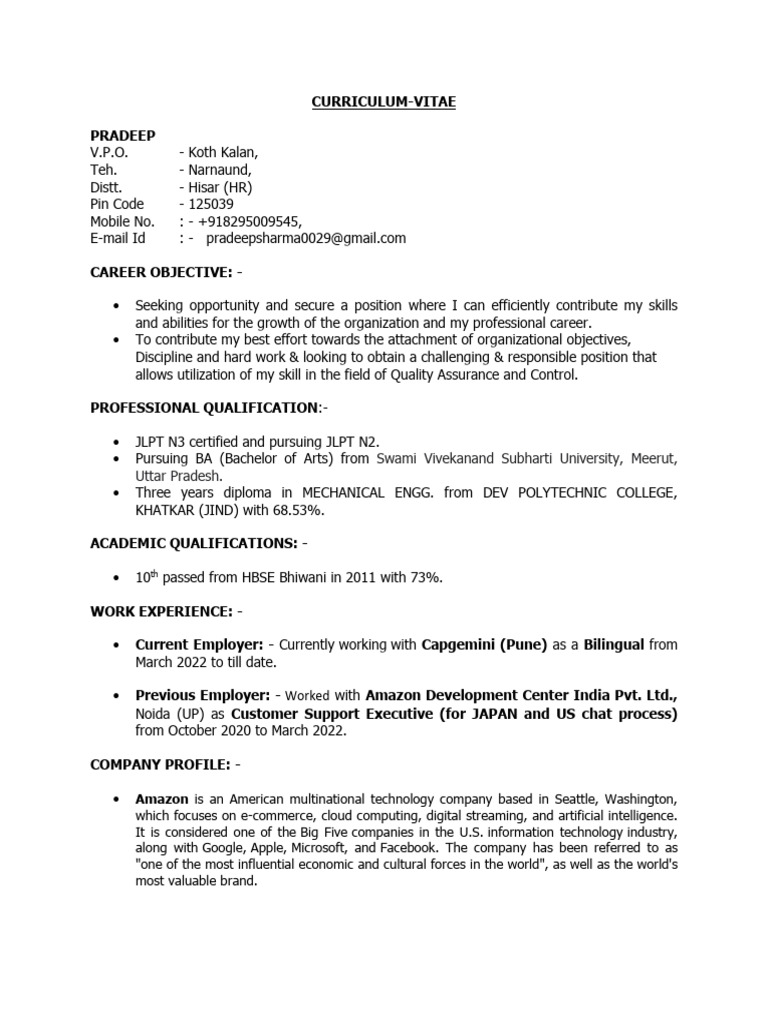 • Current Employer: - Currently working with Capgemini (Pune) as a Bilingual from